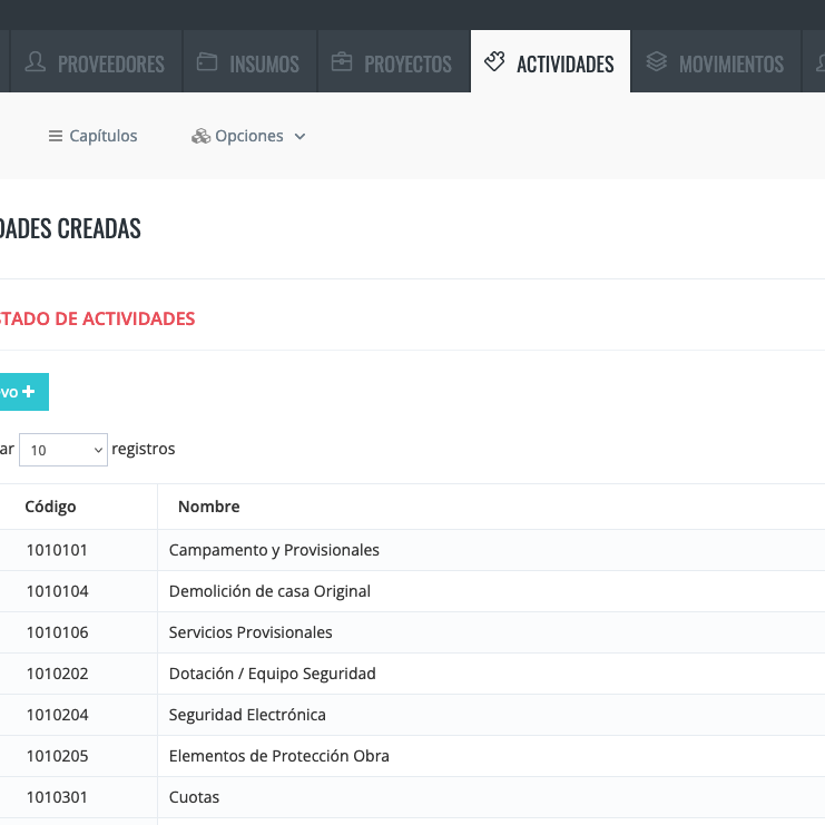 Cree capítulos, actividades, insumos o APU's
